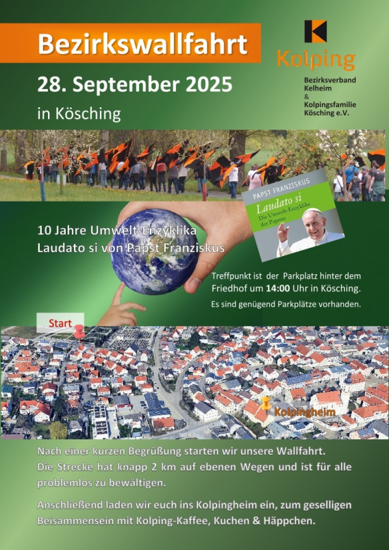 Nach einer kurzen Begrüßung starten wir unsere Wallfahrt. Die Strecke hat knapp 2 km auf ebenen Wegen und ist für alle problemlos zu bewältigen. Anschließend laden wir euch ins Kolpingheim ein, zum geselligen Beisammensein mit Kolping-Kaffee, Kuchen & Häppchen.