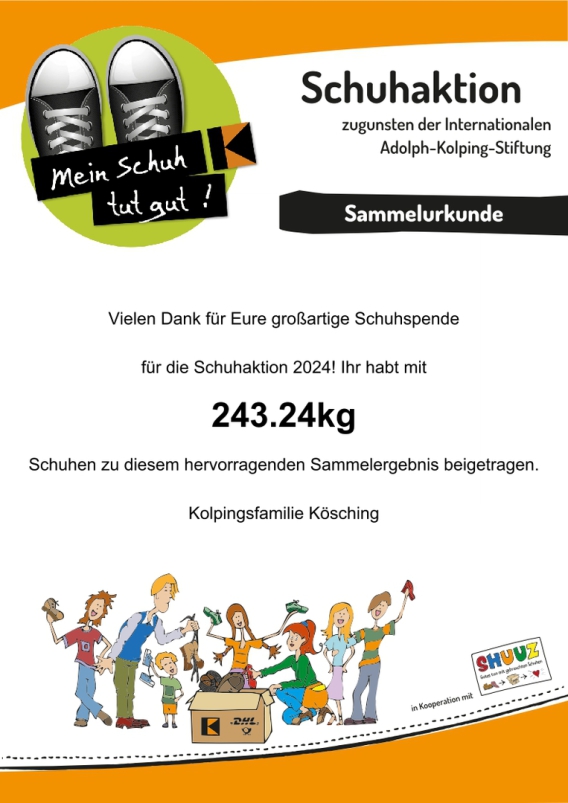 Die Sammelaktion die am Kolpinggedenktag 2024 startete, hat wieder ein tolles Ergbis gebracht. Seht selbst auf unserer Urkunde.